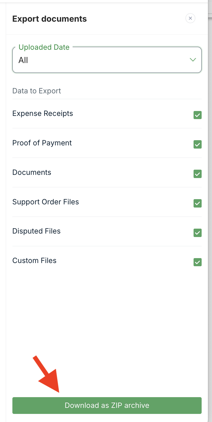 Click the green Download as ZIP archive button. Your documents will be downloaded as a ZIP file into your browser’s Downloads folder.