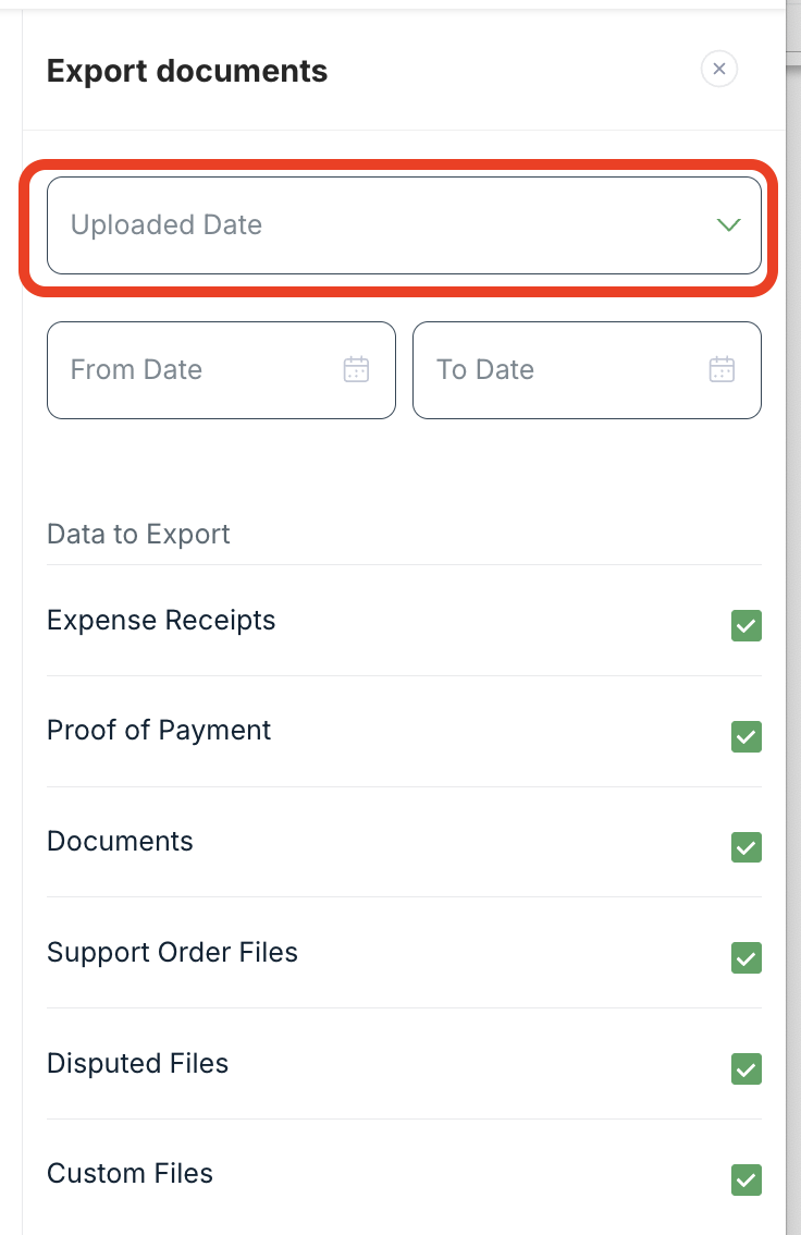 In the Export Documents panel, click the Uploaded Date dropdown and select the date range for the documents you want to download.